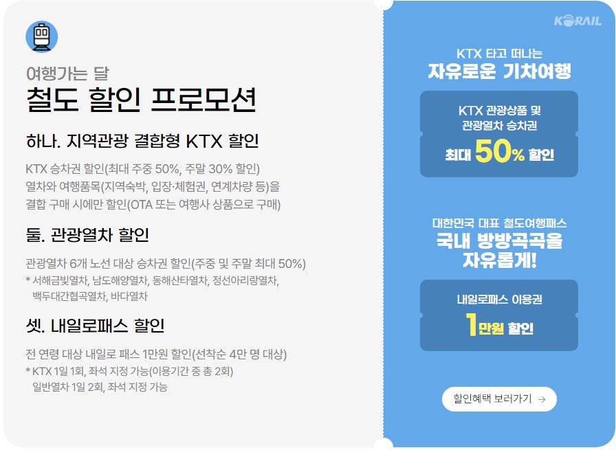 철도 할인 프로모션, 국내 항공권 할인. 렌터카 할인 등 각 지자체와 유명 어플사에서 제휴할인 이벤트를 진행 합니다.