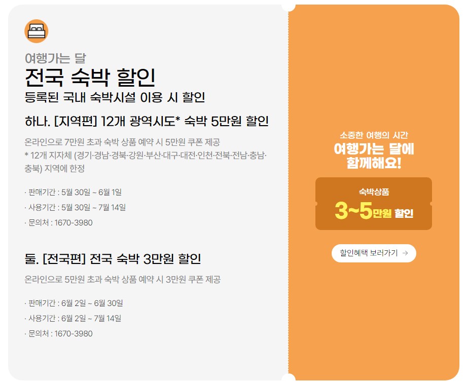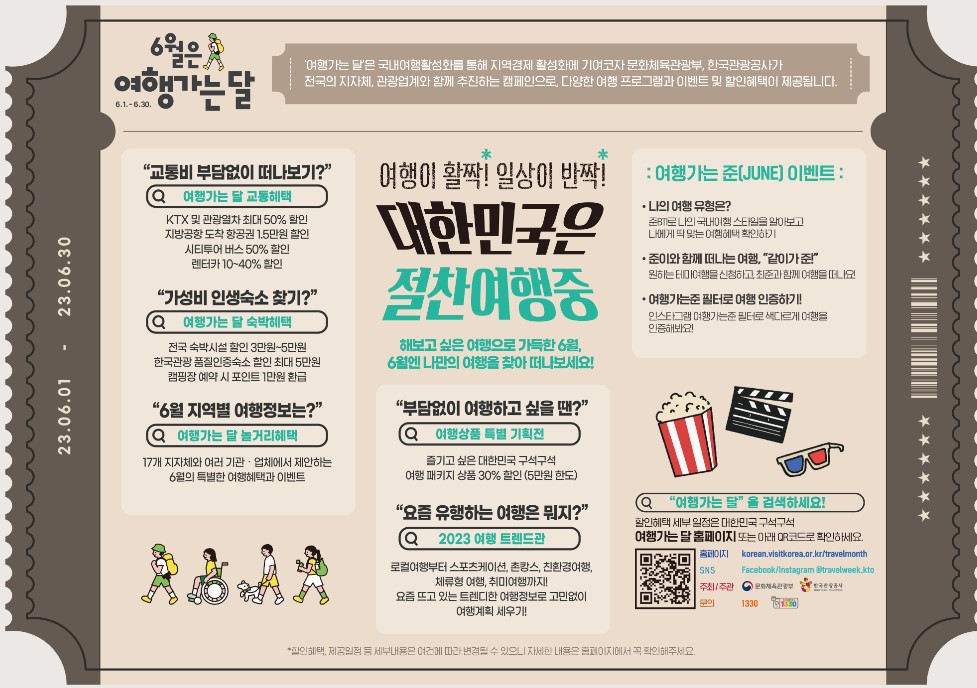 여행가는 달이란 국내여행 활성화를 위해 문화체육관광부, 한국관광공사가 전국의 지자체와 관광업계가 함께 추진하는 많은 여행 프로그램과 이벤트 프로모션등 할인혜택이 제공되는 캠페인입니다. 많은 혜택이 준비 되어 있으니 여행계획 있으신 분들은 서두르세요