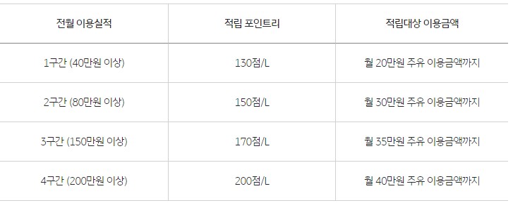 - 기준유가 : GS칼텍스 고시 휘발유가 기준 / 경유, 등유, LPG는 휘발유가로 환산한 적립률 적용