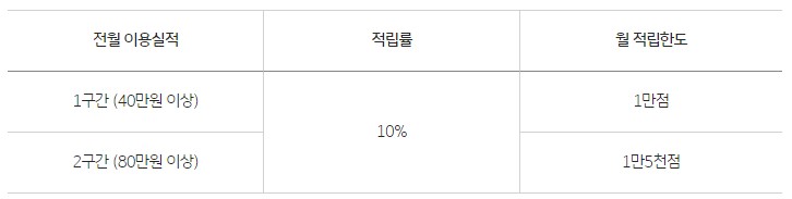 - 전월 이용실적 1구간 월 적립한도 6천점